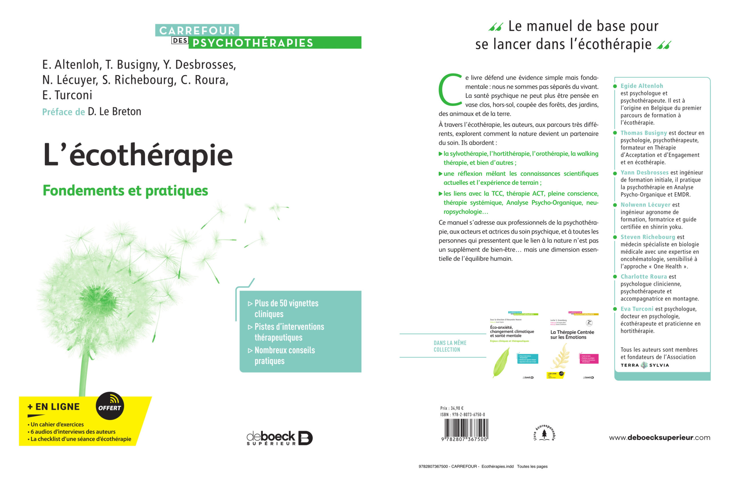 - Altenloh E., Busigny T., Debrosses, Y., Lécuyer, N., Richebourg, S., Roura, C., Turconi, E. (2025). L’écothérapie : Fondements et pratiques. Éditions De Boeck. Accéder au livre